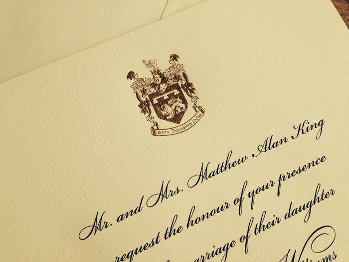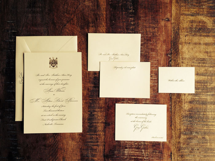 Anna’s wedding invitation suite was engraved which turned out amazingly! Engraving is a very antiquated method of printing where a plate is engraved and then pressed into the paper, leaving the images raised from the paper. Her family crest was engraved in a beautiful gold and the rest of the suite was in black. They used a wax seal to close up the envelopes- so lovely! This wedding suite was elegant from start to finish.