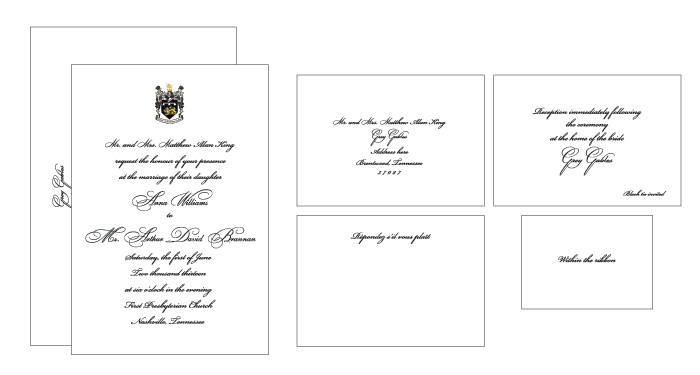 This look was inspired by the Eliza wedding suite designed by EOH. This design features an elegant calligraphy font paired with a more clean, modern text. We love the way these black and white wedding invitations come together below!